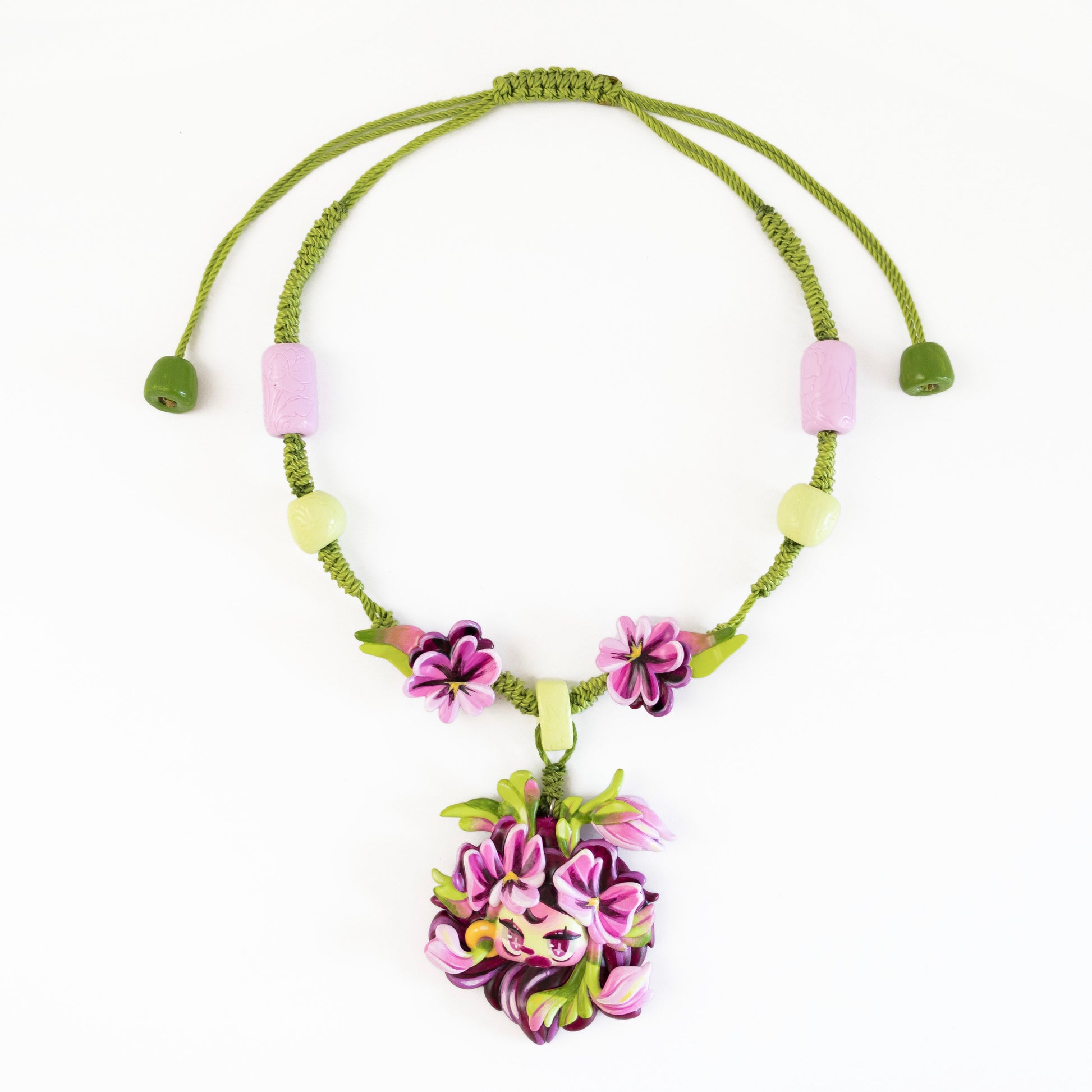 Made from resin, the pendant and beads are carefully hand-painted with detailed brushwork, making each piece one of a kind. The beads and pendant are assembled using durable nylon cord and finished with a macramé knotting technique.